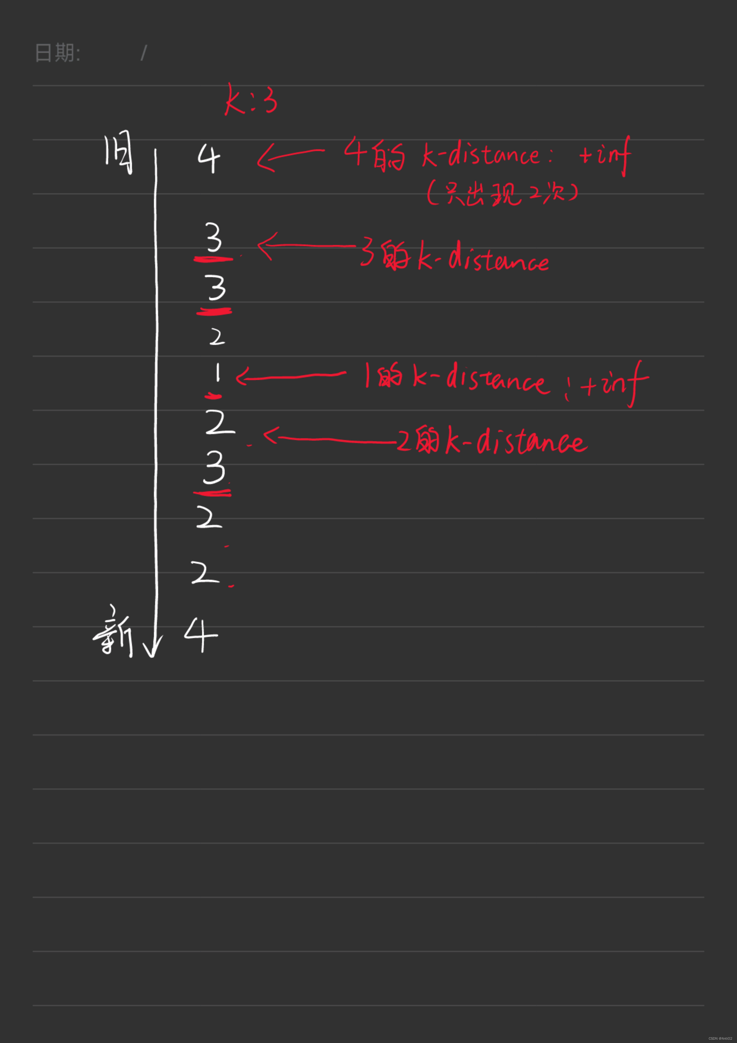如果一个数出现次数达到了K次,那么k-distance就是倒数第K次出现的位置
