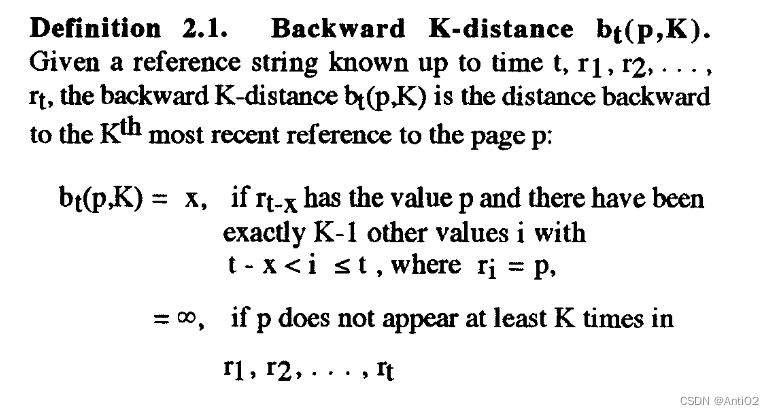 - 优先选择K-distance最大的。也就是$b_t(q,K)$最大,或者说是$HIST(q,K)$最小的。(之前看这个地方不理解,后来想通了:HIST是记录的时间,时间戳越小访问的越早,也就是距离越大)