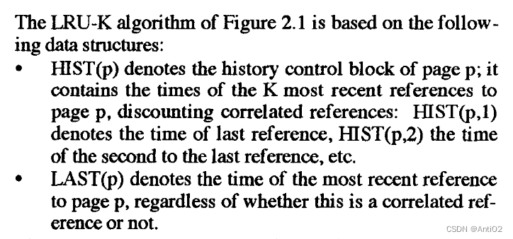 HIST(p),是关于p的访问记录(history)的。HIST(p,n)就是页面p倒数第n次被访问的时间。例如HIST(2,1)就是2号页面最后一次被访问的时间(这个是不算关联访问的,也就是说每段关联访问只被记录一次) LAST(p)就是页面p最后一次被访问的时间,这个是无论关联访问的