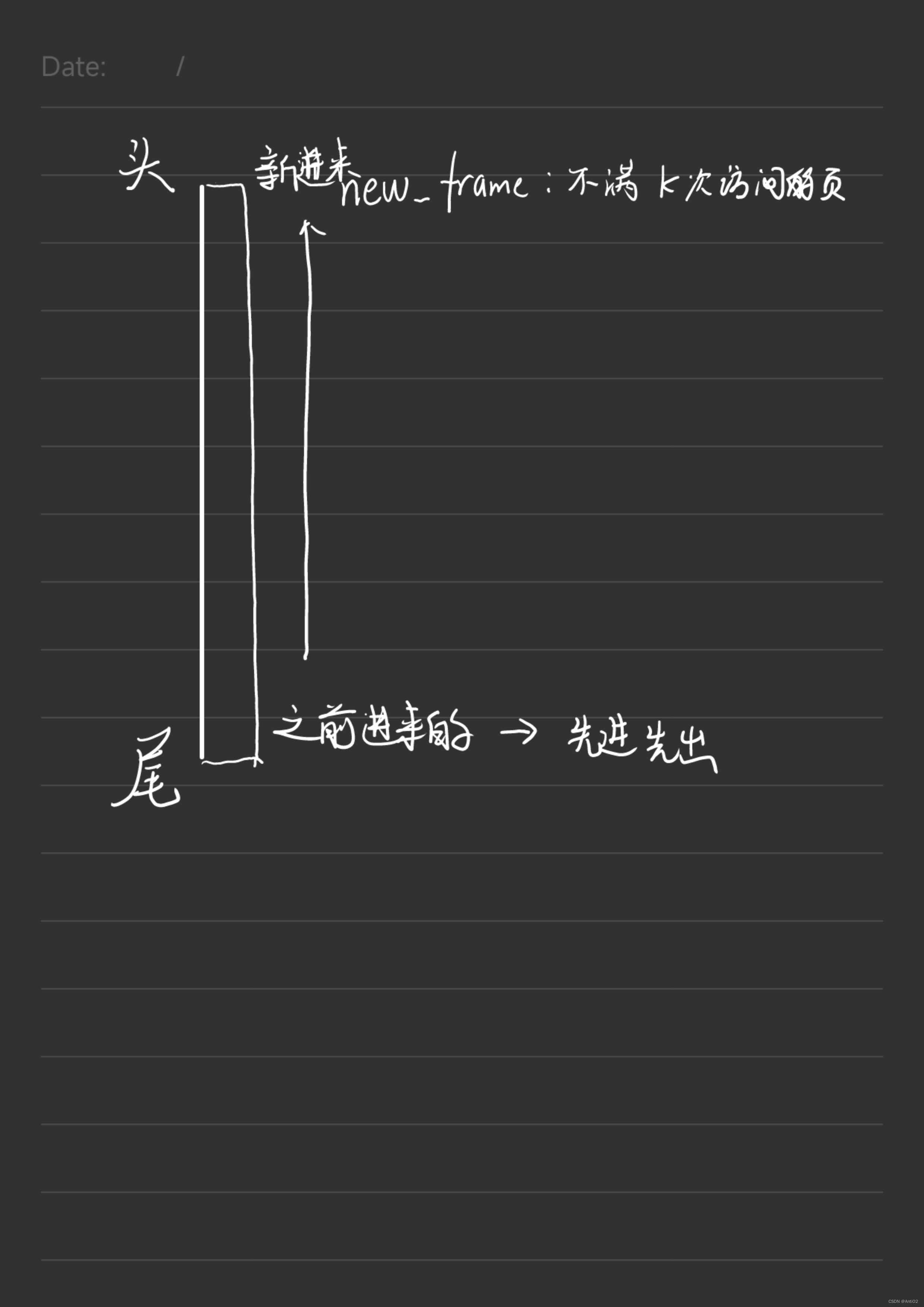 - 第一个链表是不满足k次的,我们每次通过头插法加入新的页面,如果要在这里面驱逐一个页面,采用