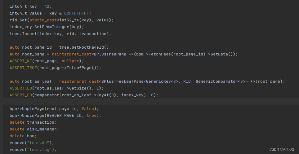 leaf_max_size_(leaf_max_size), internal_max_size_(internal_max_size) {} 分别是leaf和internal的max size 看了这些之后还是感觉有些云里雾里的,于是看`test/storage/b_plus_tree_insert_test.cpp`  测试代码中首先生成了一个Comparator,然通过文件名"test.db"生成了一个disk_manager,然后生成了bufferpoolmanager。最后将名字"foo_pk",bpm,comparator,和leaf_max_size ,internal_max_size传入生成了一个BPlusTree。在这里,keyType为GenericKey<8>,valueType为RID。  接下来创建了一个作为header_page的页面。 header_page的page_id_总是为0,用于存储元数据。包含索引名称和对应的root_id的信息。