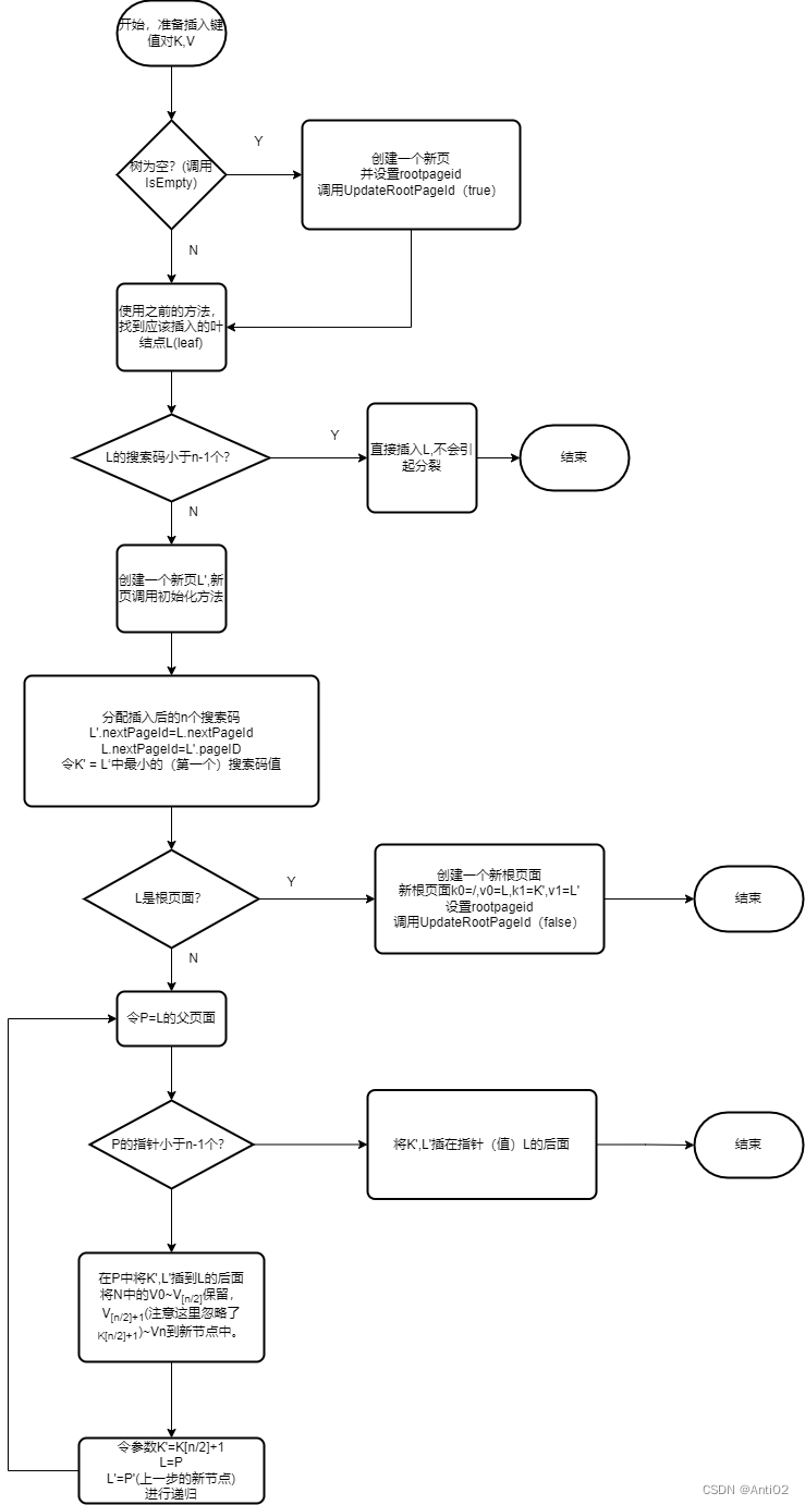 画出流程图之后,就可以实现代码了。 这里插入有一个问题:就是找到了对应的位置后该如何插入呢?键值对在页上是直接顺序储存的,好像只能采用O(n)的方法把空位依次挪出来。这个看似时间复杂度很高,但是是在内存上进行操作的,决定时间复杂度主要的因素应该是磁盘读取的时间,所以在内存上的读取时间可以忽略不记。