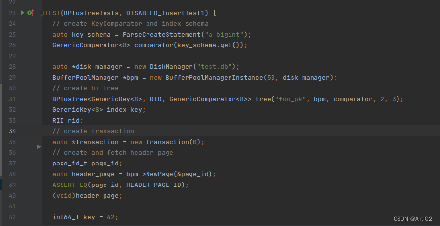 leaf_max_size_(leaf_max_size), internal_max_size_(internal_max_size) {} 分别是leaf和internal的max size 看了这些之后还是感觉有些云里雾里的,于是看`test/storage/b_plus_tree_insert_test.cpp`  测试代码中首先生成了一个Comparator,然通过文件名"test.db"生成了一个disk_manager,然后生成了bufferpoolmanager。最后将名字"foo_pk",bpm,comparator,和leaf_max_size ,internal_max_size传入生成了一个BPlusTree。在这里,keyType为GenericKey<8>,valueType为RID。  接下来创建了一个作为header_page的页面。 header_page的page_id_总是为0,用于存储元数据。包含索引名称和对应的root_id的信息。