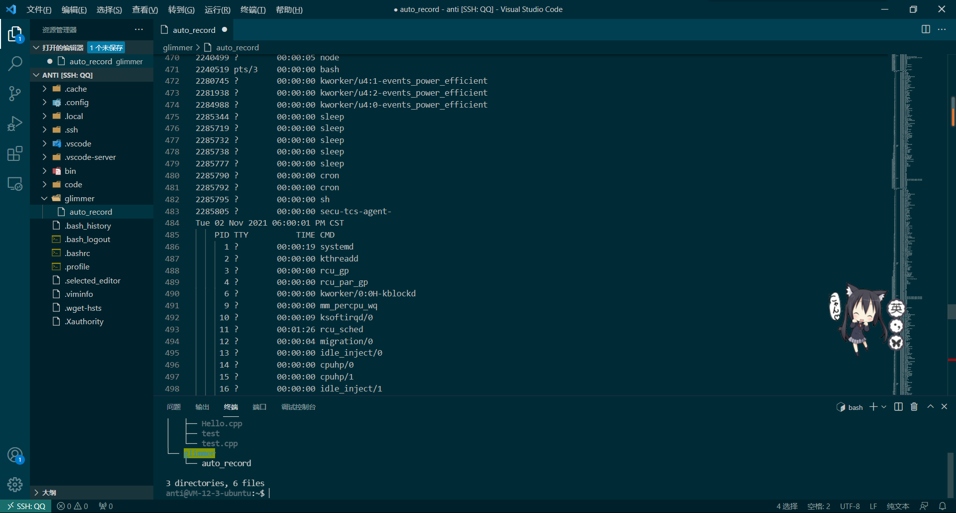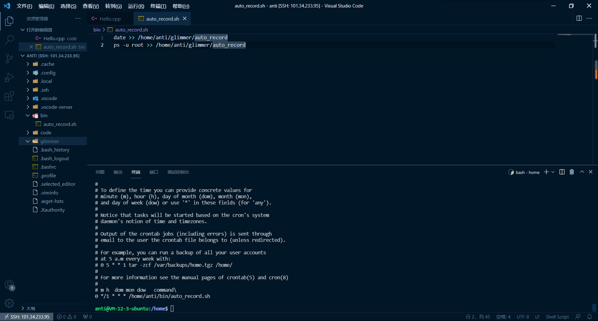 用脚本ps -u root >> /home/anti/glimmer/auto_record重定向输出到指定文件